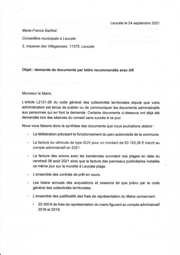 Leucate Citoyenne a adressé un courrier en septembre dernier au maire afin de lui demander certains documents qu’il est tenu de publier ou communiquer aux personnes qui en font la demande, selon l’article L2121-26 du Code des Collectivités Locales.